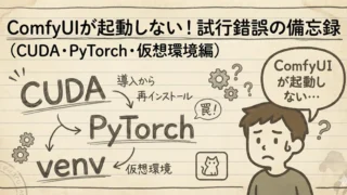 ComfyUIComfyUIが起動しない!試行錯誤の備忘録(CUDA・PyTorch・仮想環境編) ComfyUIが起動しない…!CUDA Toolkitの導入からPyTorch再インストール、仮想環境の罠まで、試行錯誤の流れを備忘録としてまとめました。同じように迷った人の参考になれば幸いです。 2025.12.09ComfyUI