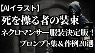 ネクロマンサー服装プロンプト20選&作例集。黒衣・革鎧・骨片などダークファンタジー衣装の描写プロンプトを完全収録。AIイラストの完成度が劇的に向上します!